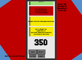 You are trying to stay in the loop and be up-to-date and informed on the latest social media drama. More importantly, you want clout. Reshare posts to gain clout. The more of the same-colored posts you share at a time, the more clout you get. Maintain a streak, by resharing 3+ of the same-colored posts at a time. Each streak you gain, you also gain a discard, to remove a post. You must get as much clout as you can, in a limited number of turns. Wagers allow you to sacrifice something, to gain something else.